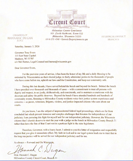 Milwaukee, Wisconsin Judge Hannah Dugan officially resigned yesterday following her December federal jury conviction on the felony charge of obstructing immigration agents. In April, Dugan confronted federal officers at her courthouse and directed an undocumented Mexican immigrant through a private door to evade arrest. She was acquitted on a related misdemeanor concealing charge, but her felony conviction led to a choice of resigning or facing the loss of her position from the state. Facing imminent impeachment proceedings by Wisconsin lawmakers and ongoing appeals, Dugan submitted her resignation letter to Governor Tony Evers in an effort to signal her commitment to judicial independence despite, which some may say she had failed to live by. The former judge was suspended without pay since her arrest, and faces up to five years in prison at sentencing, though as a first-time nonviolent offender, such significant incarceration is unlikely. Her defense continues to challenge the verdict.First Circuit Reprimands District Judge (Again)